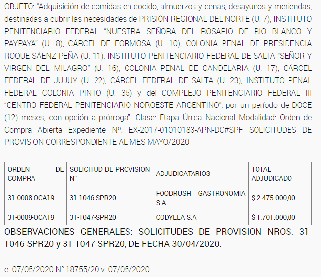 El pasado jueves fue publicado en el Boletín Oficial la contratación de dos empresas gastronómicas que brindarán la provisión de alimento a institutos penitenciarios durante el mes de mayo. Por parte del Servicio Penitenciario Federal.